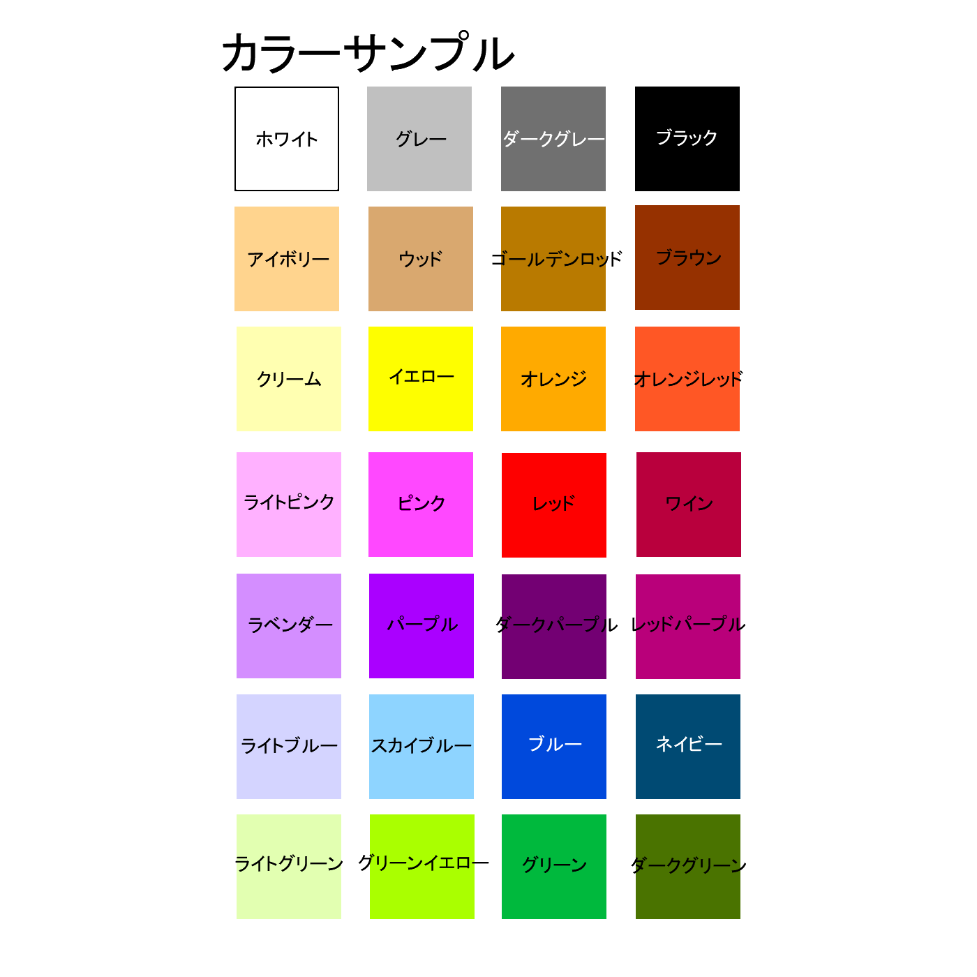 ホワイト、グレー、ダークグレー、ブラック、アイボリー、ウッド、ゴールデンロッド、ブラウン、クリーム、イエロー、オレンジ、オレンジレッド、ライトピンク、ピンク、レッド、ワイン、ラベンダー、パープル、ダークパープル、レッドパープル、ライトブルー、スカイブルー、ブルー、ネイビー、ライトグリーン、グリーンイエロー、グリーン、ダークグリーン