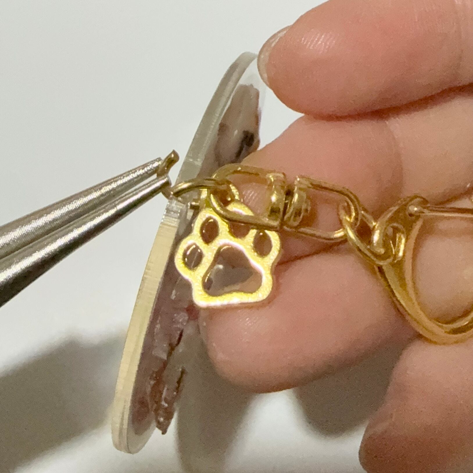 チャームの取り付け位置によってアクリル部分にかぶらせないようにする方法もございますので、下部の「キーホルダーパーツをつける」をご覧くださいませ。