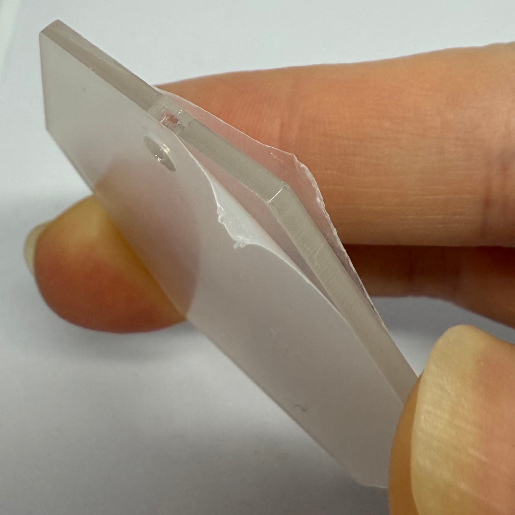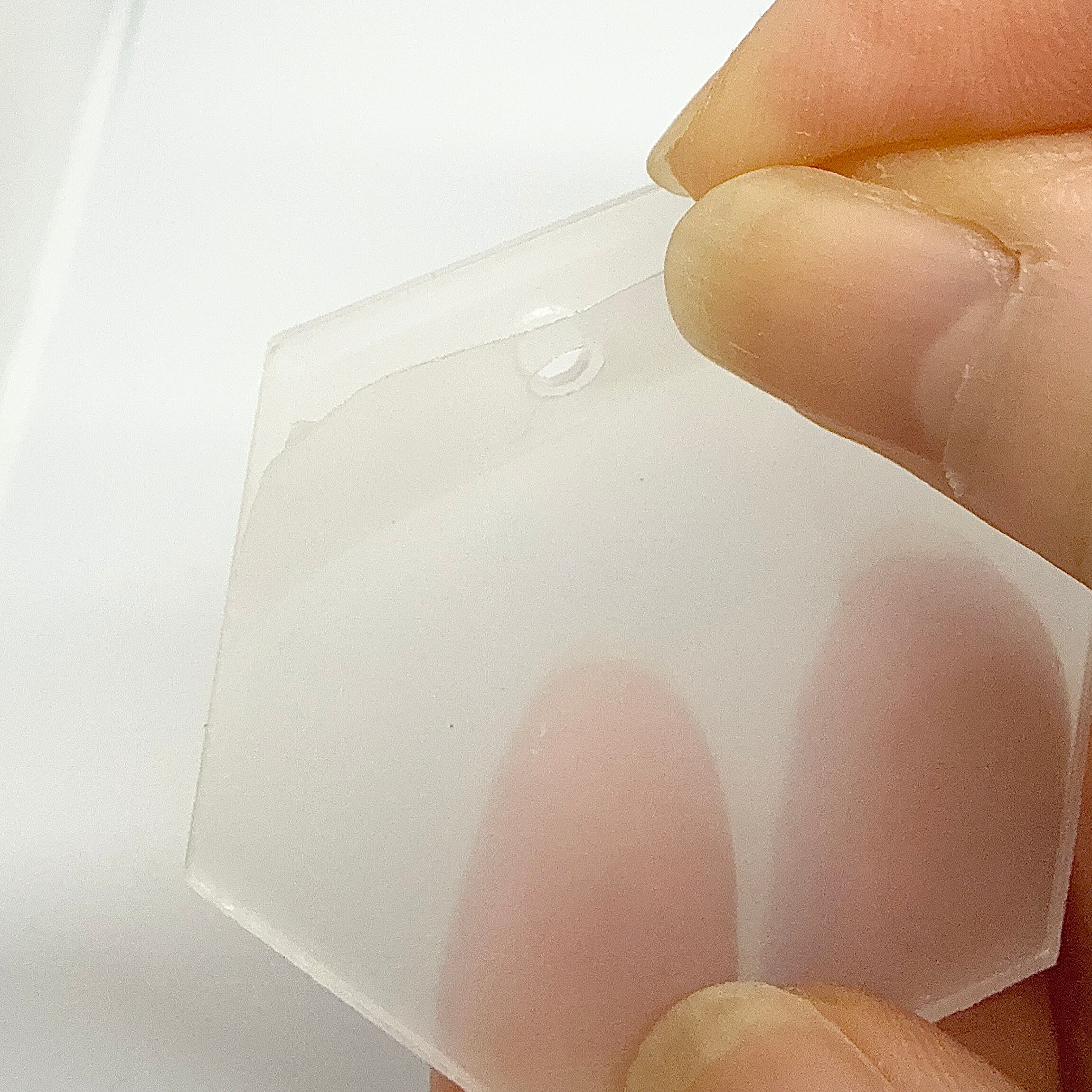 裏面のフィルムを剥がすタイミングはおまかせしておりますが、剥がすのを忘れてキーホルダーパーツをつけてしまう場合もございますのでご注意ください。