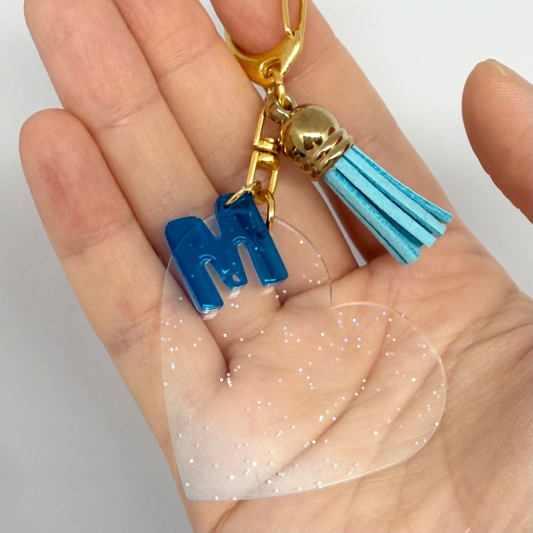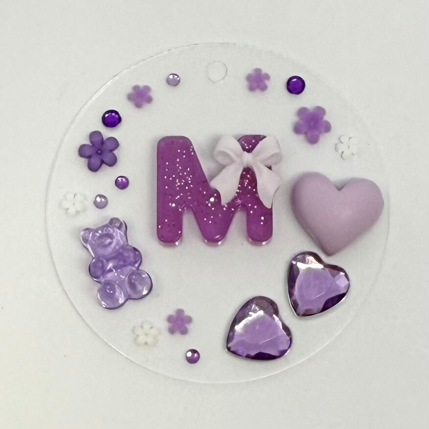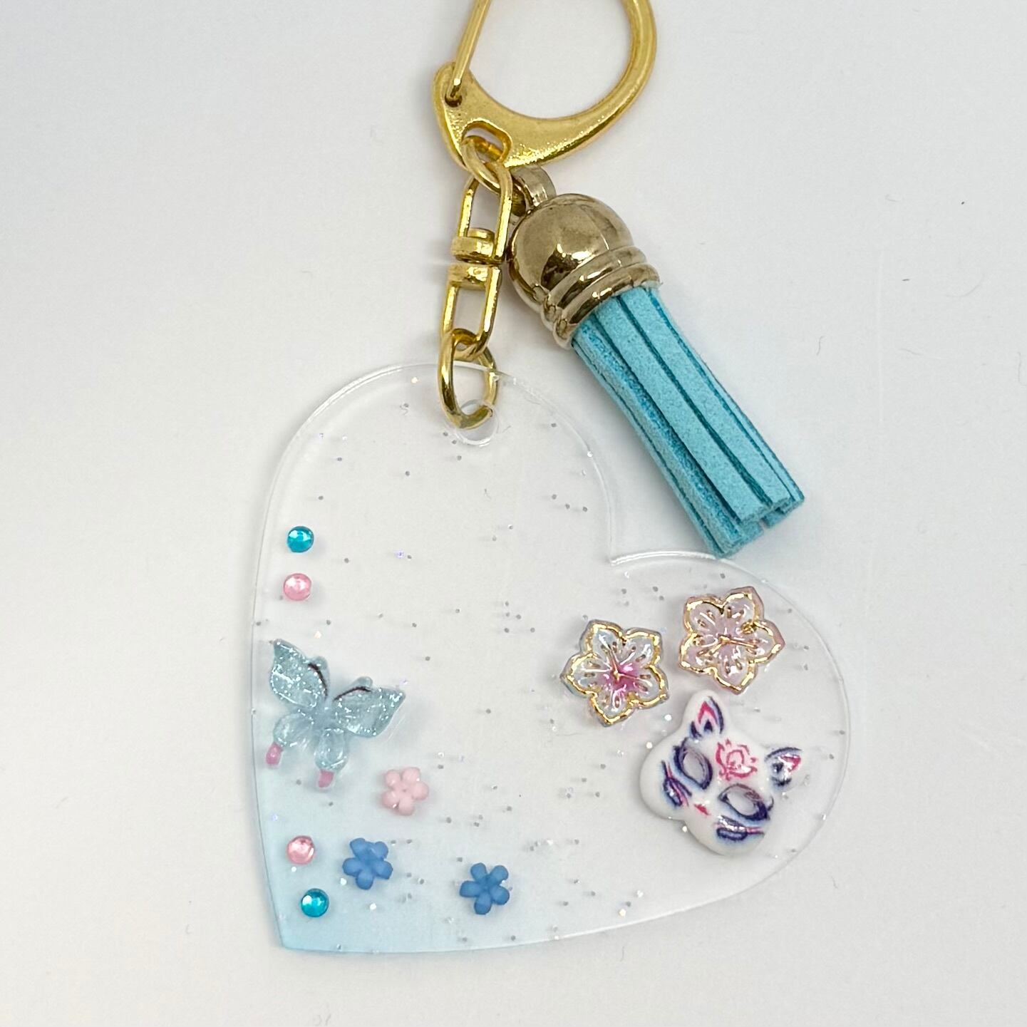 キーホルダー部分に取り付けるチャームを選ばれたお客様は、上から下げた時にアクリル部分にかかってしまう場合がございますので、位置を確認しながらパーツの配置を決めていただくと、全てのパーツが隠れずに配置できます。