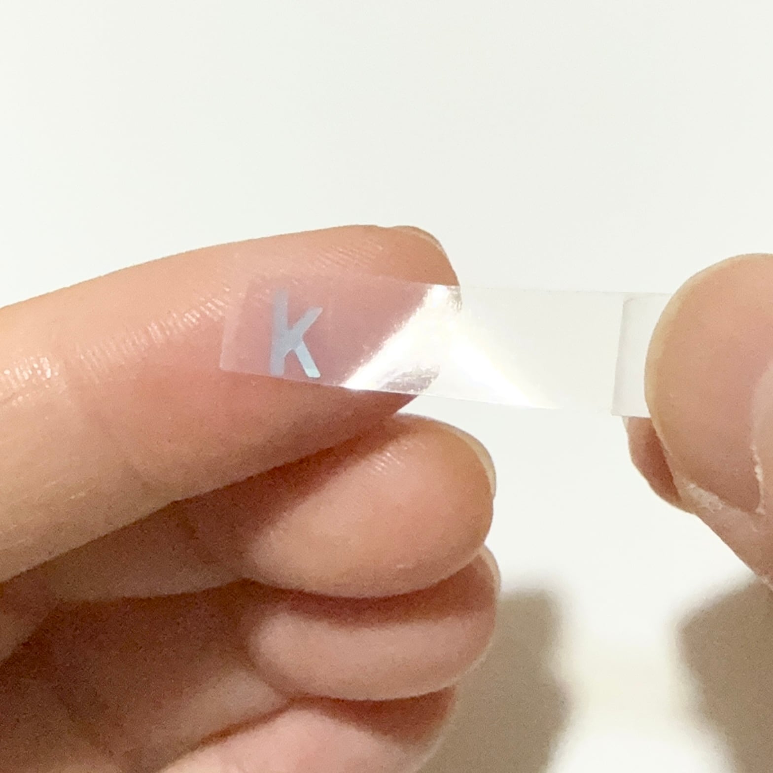 細かいアルファベットのホログラムパーツを選ばれたお客様は、シール素材にあらかじめ名前を貼り付けます。