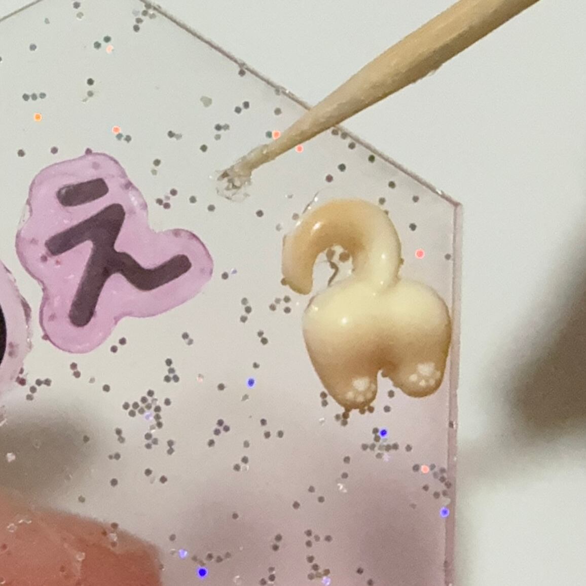 小さいパーツは裏面にボンドがつけにくいので、付属のつまようじでボンドを取り、アクリルプレート側にボンドをのせた上からパーツをのせていただくと、キレイにつけることができます。